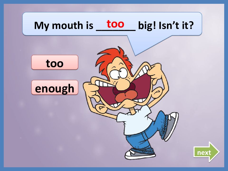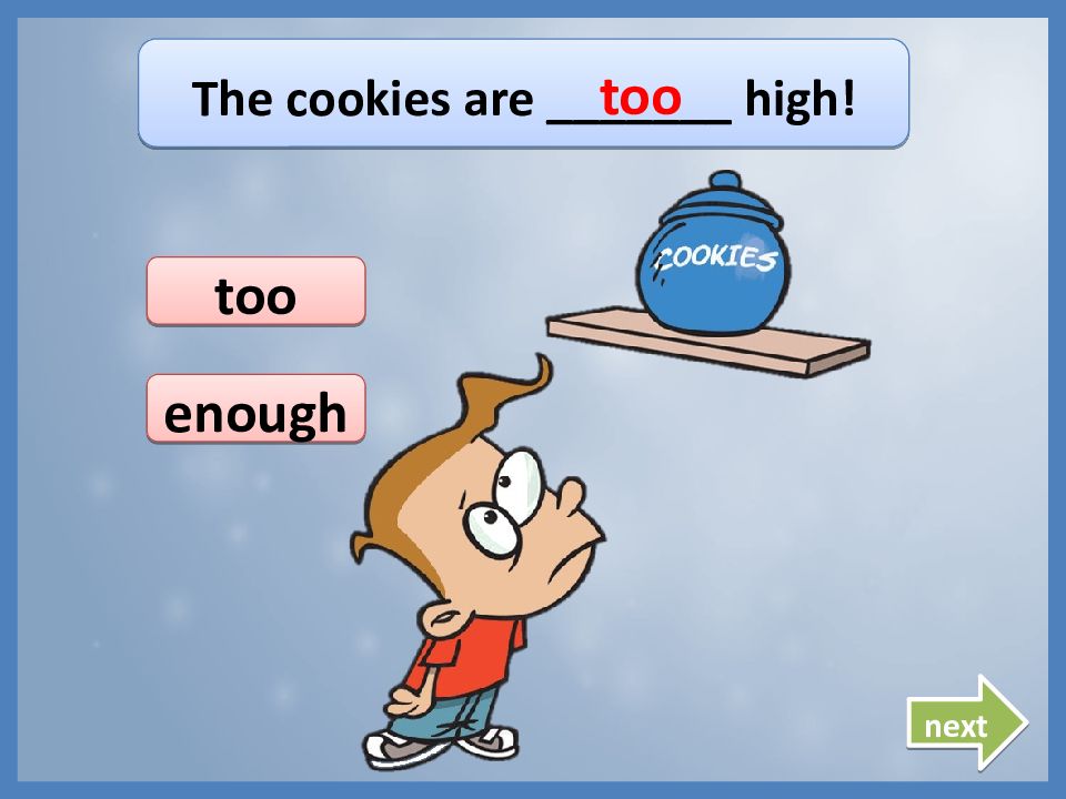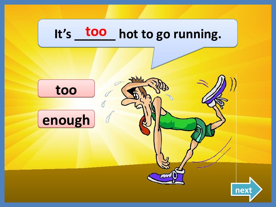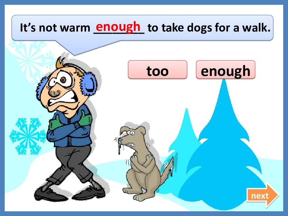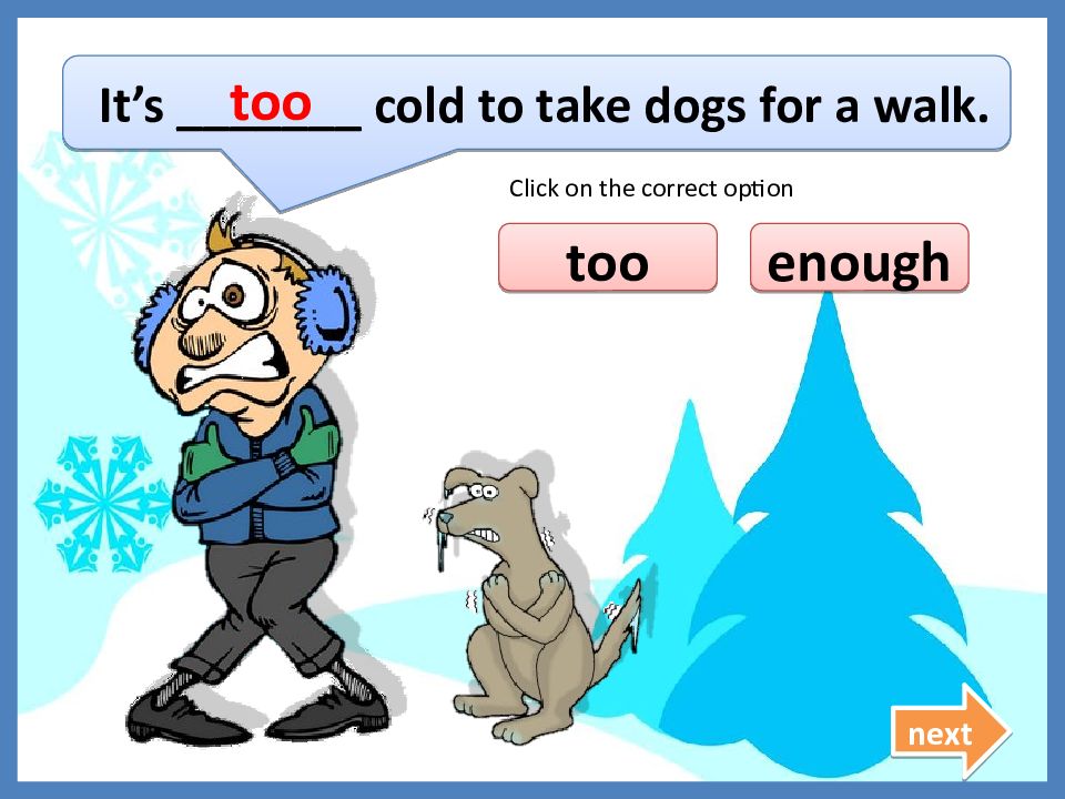 It’s _______ cold to take dogs for a walk. too enough too next Click on the correct option