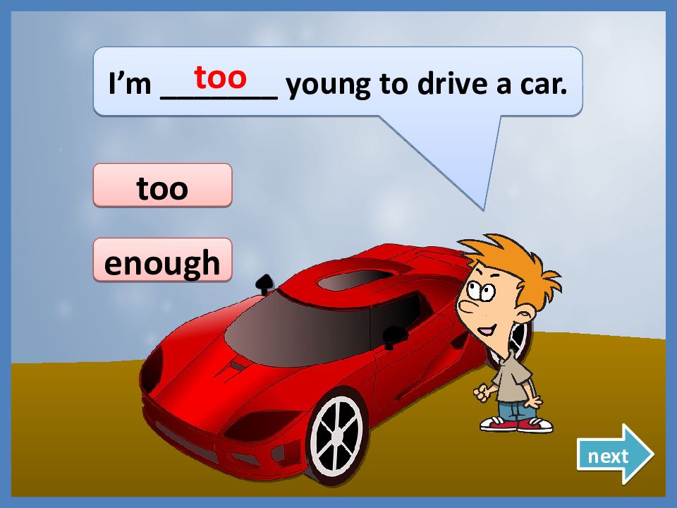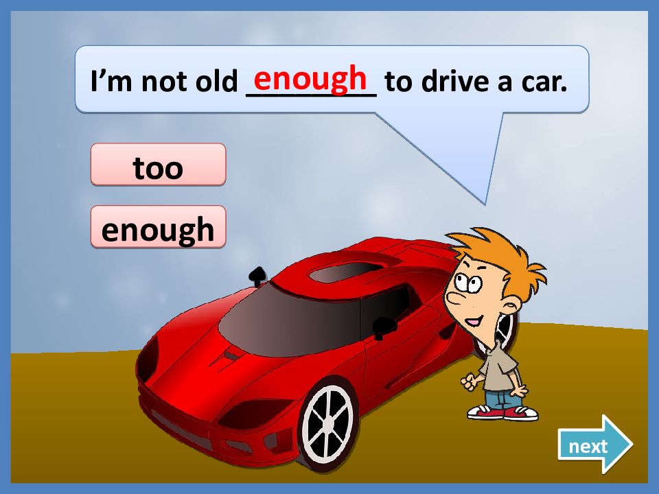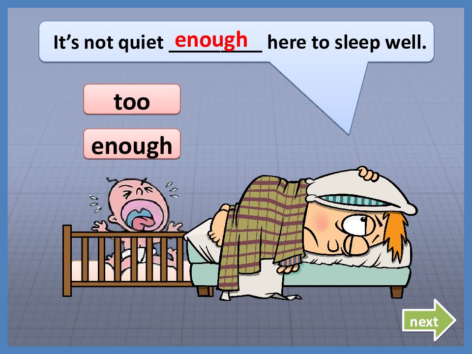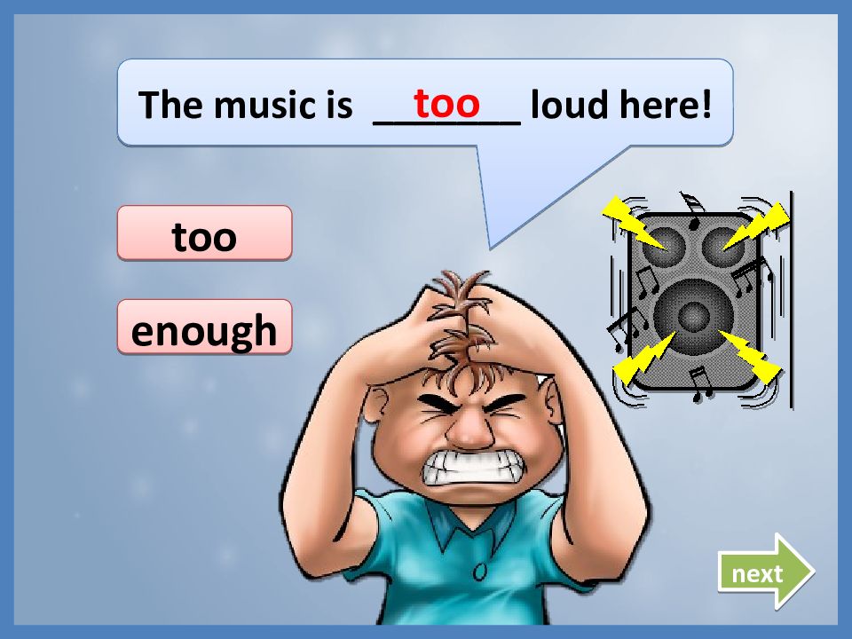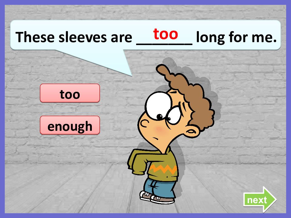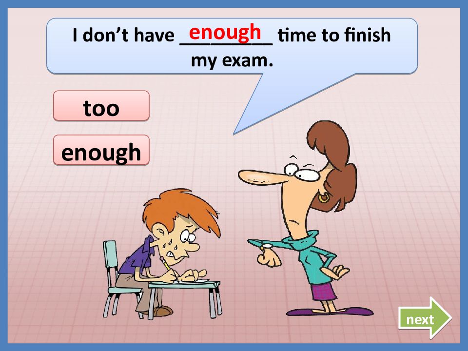 It’s _______ cold to take dogs for a walk. too enough too next Click on the correct option