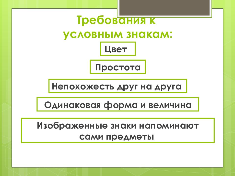 Простота Непохожесть друг на друга Изображенные знаки напоминают сами предметы Цвет Одинаковая форма и величина Требования к условным знакам: