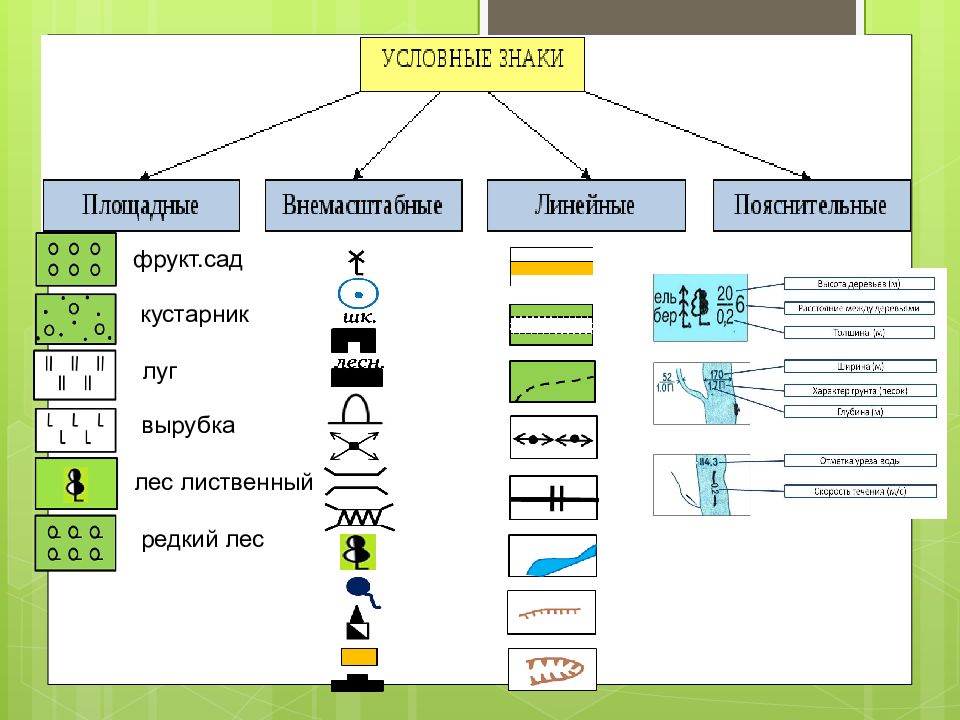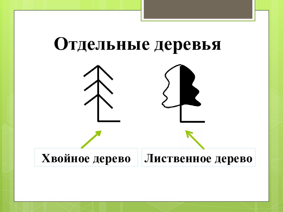 Одиночное лиственное дерево Одиночное хвойное дерево Хвойный лес Лиственный лес Куст Луг Вырубка Смешанный лес Условные знаки - РАСТИТЕЛЬНОСТИ