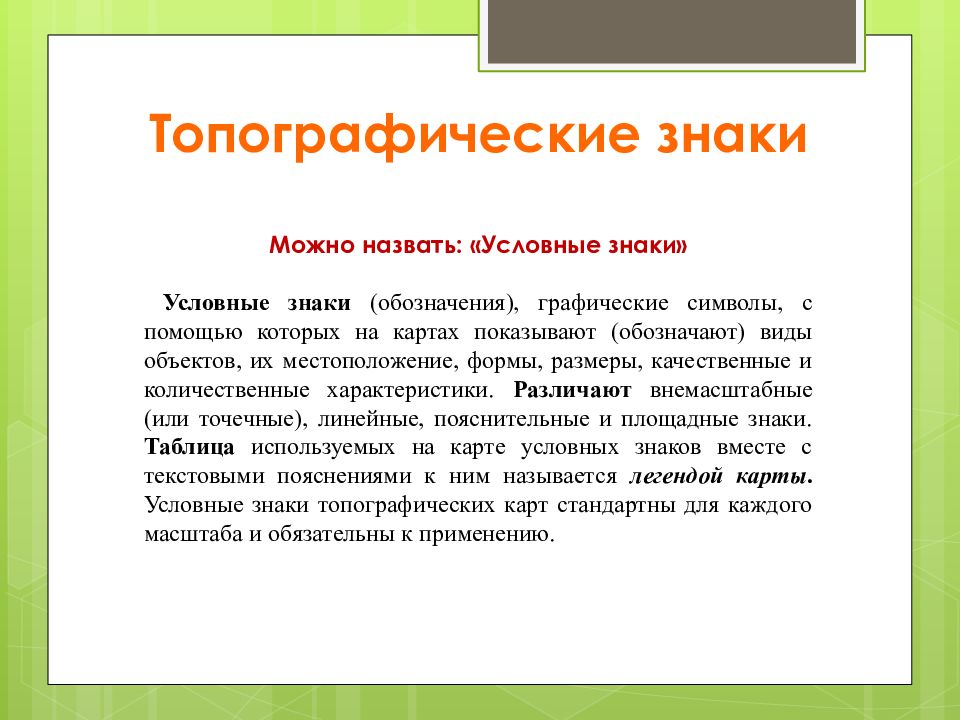 Можно назвать: «Условные знаки» Условные знаки (обозначения ), графические символы, с помощью которых на картах показывают (обозначают) виды объектов, их местоположение, формы, размеры, качественные и количественные характеристики. Различают внемасштабные (или точечные), линейные, пояснительные и площадные знаки. Таблица используемых на карте условных знаков вместе с текстовыми пояснениями к ним называется легендой карты. Условные знаки топографических карт стандартны для каждого масштаба и обязательны к применению.