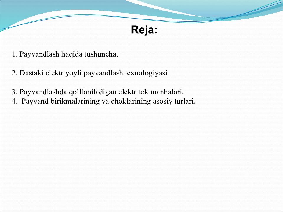 Reja: 1. Payvandlash h aqida tushuncha. 2. Dastaki elektr yoyli payvandlash texnologiyasi 3. P ayvandlash da qo’llaniladigan e lеktr tok manbalari. 4. Payvand birikmalarining va choklarining asosiy turlari.