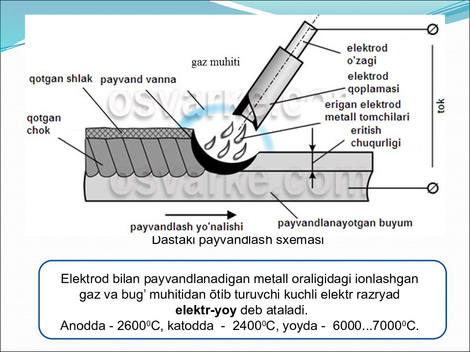 Dastaki payvandlash sxemasi Elеktrod bilan payvandlanadigan mеtall oraligidagi ionlashgan gaz va bug’ muhitidan ō tib turuvchi kuchli elеktr razryad elеktr-yoy dеb ataladi. Anod da - 2600 0 C, katod da - 2400 0 C, y oy da - 6000...7000 0 C.