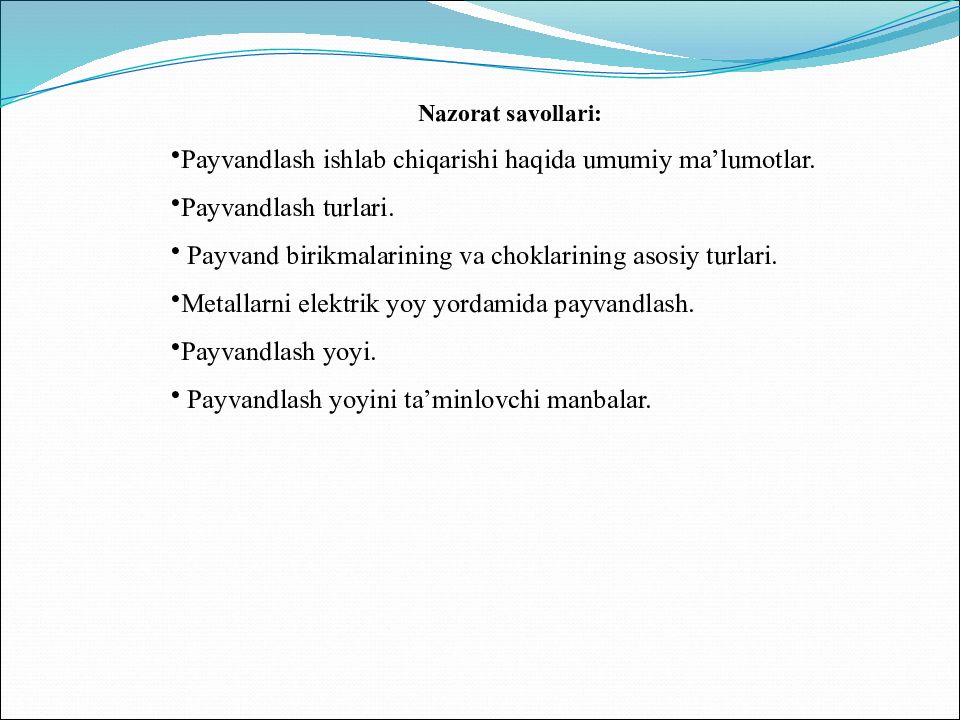 Nazorat savollari: Payvandlash ishlab chiqarishi haqida umumiy ma’lumotlar. Payvandlash turlari. Payvand birikmalarining va choklarining asosiy turlari. Metallarni elektrik yoy yordamida payvandlash. Payvandlash yoyi. Payvandlash yoyini ta’minlovchi manbalar.