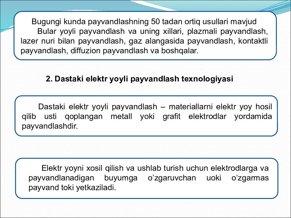Bugungi kunda payvandlashning 50 tadan ortiq usullari mavjud Bular yoyli payvandlash va uning xillari, plazmali payvandlash, lazer nuri bilan payvandlash, gaz alangasida payvandlash, kontaktli payvandlash, diffuzion payvandlash va boshqalar. 2. Dastaki elektr yoyli payvandlash texnologiyasi Dastaki elektr yoyli payvandlash – materiallarni elektr yoy hosil qilib usti qoplangan metall yoki grafit elektrodlar yordamida payvandlashdir. Elektr yoyni xosil qilish va ushlab turish uchun elektrodlarga va payvandlanadigan buyumga o’zgaruvchan uoki o’zgarmas payvand toki yetkaziladi.