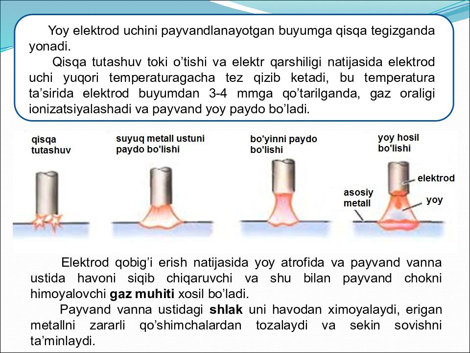 Yoy elektrod uchini payvandlanayotgan buyumga qisqa tegizganda yonadi. Qisqa tutashuv toki o’tishi va elektr qarshiligi natijasida elektrod uchi yuqori temperaturagacha tez qizib ketadi, bu temperatura ta’sirida elektrod buyumdan 3-4 mmga qo’tarilganda, gaz oraligi ionizatsiyalashadi va payvand yoy paydo bo’ladi. Elektrod qobig’i erish natijasida yoy atrofida va payvand vanna ustida havoni siqib chiqaruvchi va shu bilan payvand chokni himoyalovchi gaz muhiti xosil bo’ladi. Payvand vanna ustidagi shlak uni havodan ximoyalaydi, erigan metallni zararli qo’shimchalardan tozalaydi va sekin sovishni ta’minlaydi.