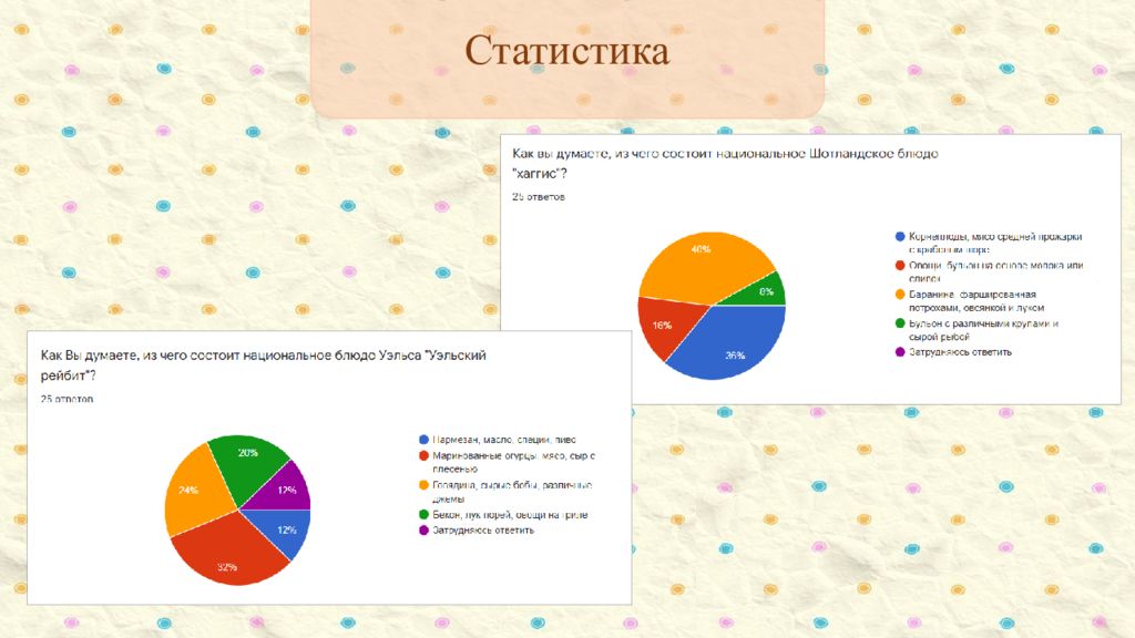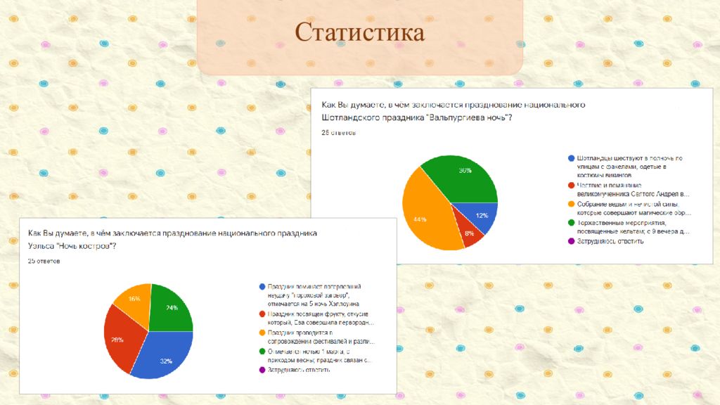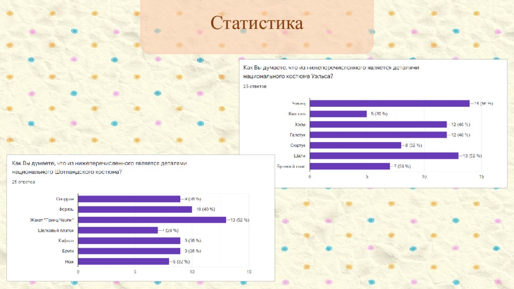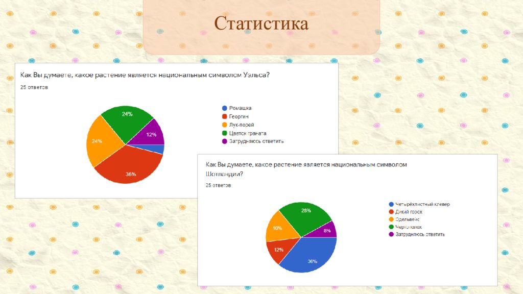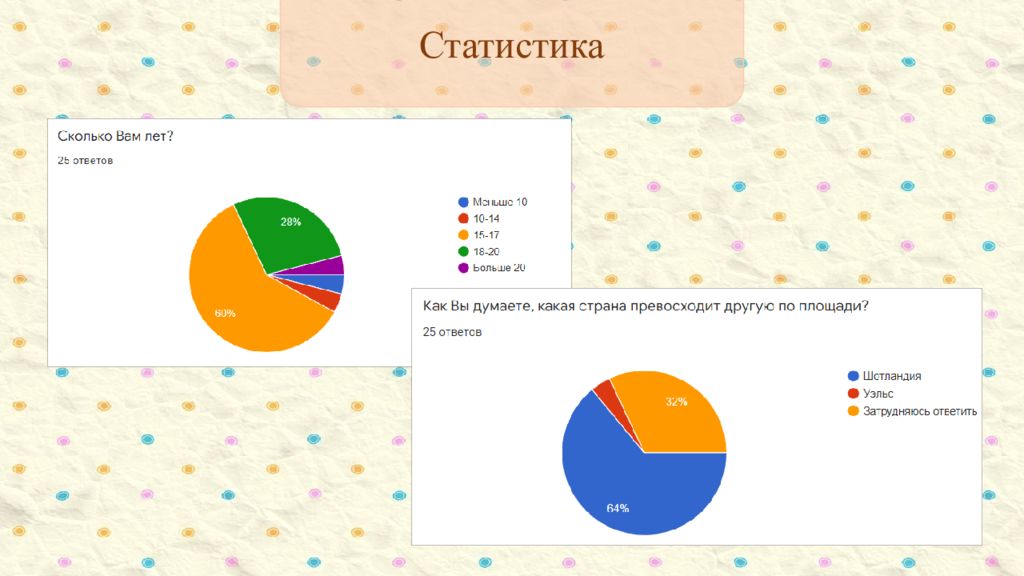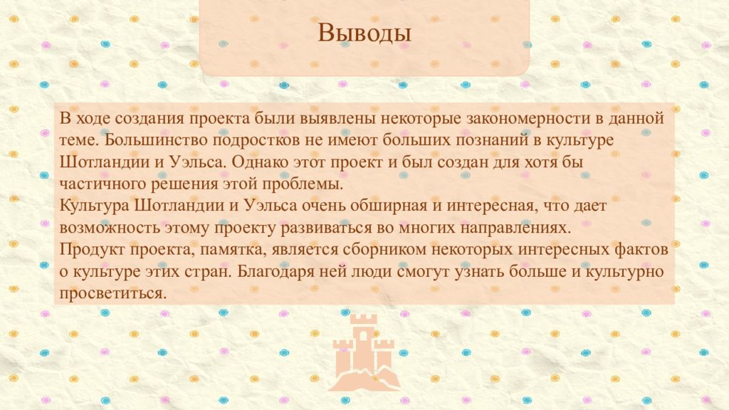 Выводы В ходе создания проекта были выявлены некоторые закономерности в данной теме. Большинство подростков не имеют больших познаний в культуре Шотландии и Уэльса. Однако этот проект и был создан для хотя бы частичного решения этой проблемы. Культура Шотландии и Уэльса очень обширная и интересная, что дает возможность этому проекту развиваться во многих направлениях. Продукт проекта, памятка, является сборником некоторых интересных фактов о культуре этих стран. Благодаря ней люди смогут узнать больше и культурно просветиться.