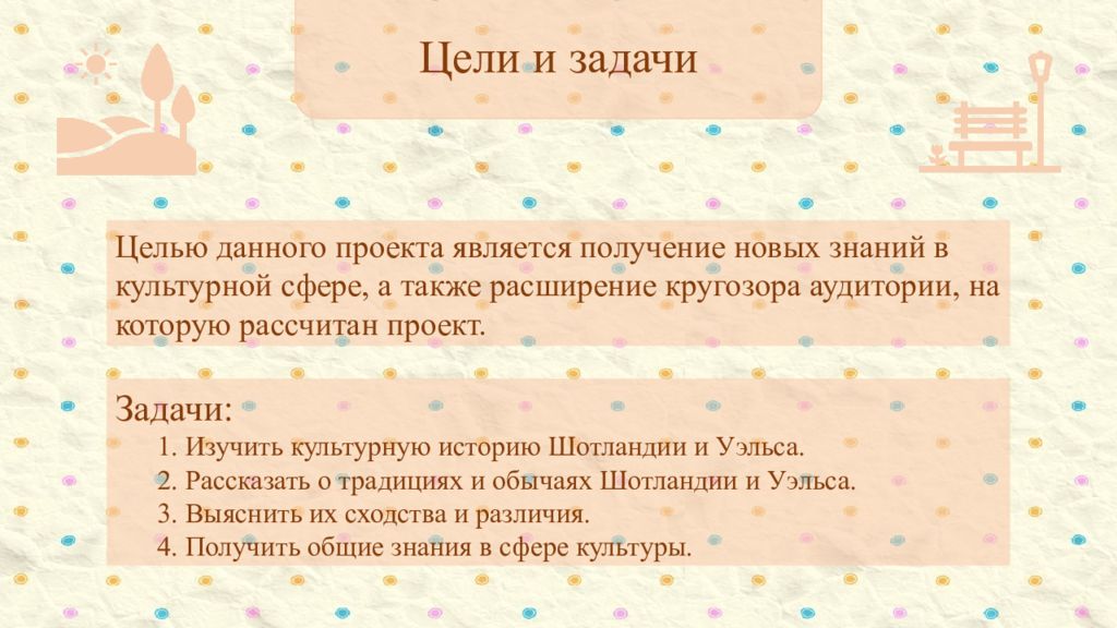 Цели и задачи Целью данного проекта является получение новых знаний в культурной сфере, а также расширение кругозора аудитории, на которую рассчитан проект. Задачи: 1. Изучить культурную историю Шотландии и Уэльса. 2. Рассказать о традициях и обычаях Шотландии и Уэльса. 3. Выяснить их сходства и различия. 4. Получить общие знания в сфере культуры.