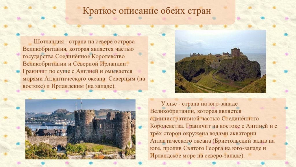 Шотландия - страна на севере острова Великобритания, которая является частью государства Соединённое Королевство Великобритании и Северной Ирландии. Граничит по суше с Англией и омывается морями Атлантического океана: Северным (на востоке) и Ирландским (на западе). Краткое описание обеих стран Уэльс - страна на юго-западе Великобритании, которая является административной частью Соединённого Королевства. Граничит на востоке с Англией и с трёх сторон окружена водами акватории Атлантического океана (Бристольский залив на юге, пролив Святого Георга на юго-западе и Ирландское море на северо-западе).