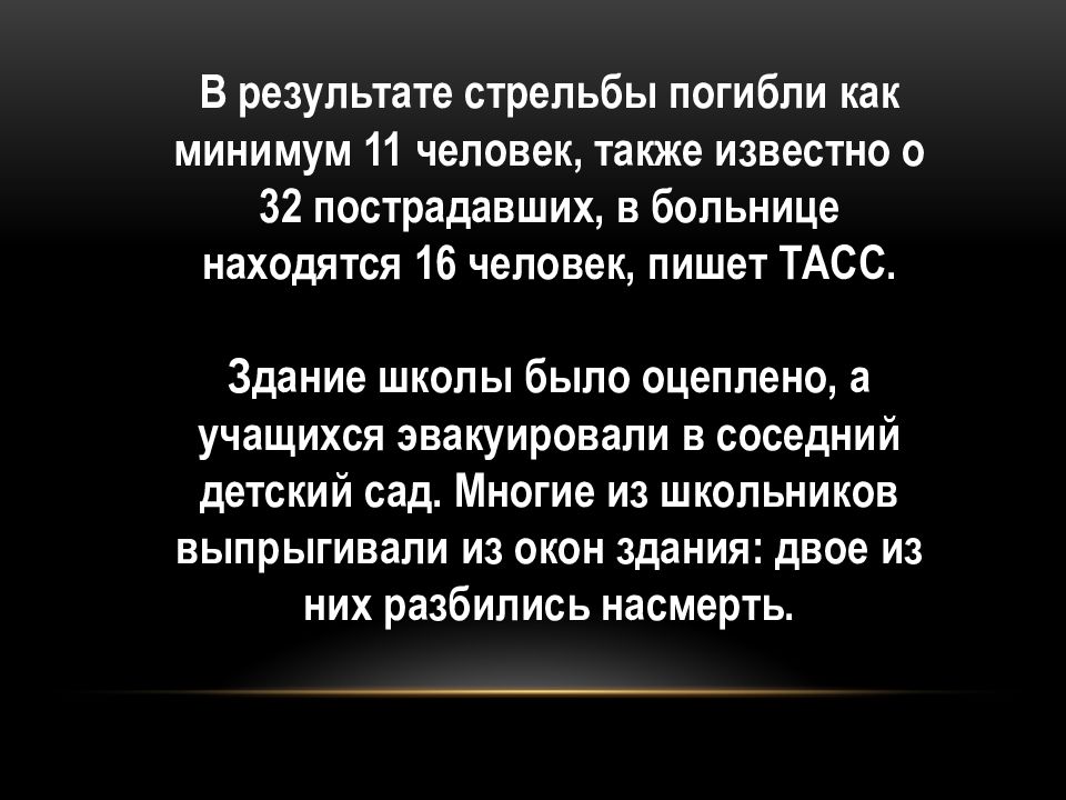 В результате стрельбы погибли как минимум 11 человек, также известно о 32 пострадавших, в больнице находятся 16 человек, пишет ТАСС. Здание школы было оцеплено, а учащихся эвакуировали в соседний детский сад. Многие из школьников выпрыгивали из окон здания: двое из них разбились насмерть.