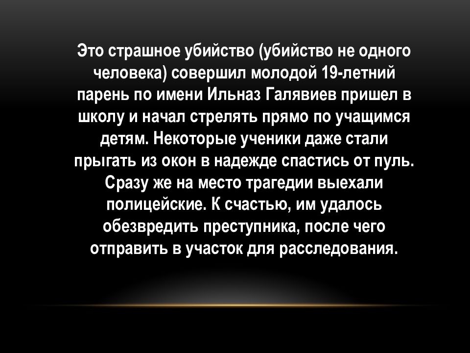 Это страшное убийство (убийство не одного человека) совершил молодой 19-летний парень по имени Ильназ Галявиев пришел в школу и начал стрелять прямо по учащимся детям. Некоторые ученики даже стали прыгать из окон в надежде спастись от пуль. Сразу же на место трагедии выехали полицейские. К счастью, им удалось обезвредить преступника, после чего отправить в участок для расследования.