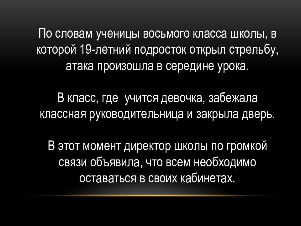 По словам ученицы восьмого класса школы, в которой 19-летний подросток открыл стрельбу, атака произошла в середине урока. В класс, где учится девочка, забежала классная руководительница и закрыла дверь. В этот момент директор школы по громкой связи объявила, что всем необходимо оставаться в своих кабинетах.