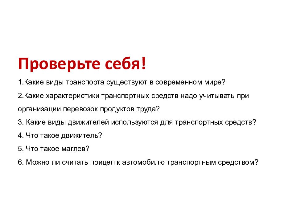 Слайд 32: Проверьте себя! 1.Какие виды транспорта существуют в современном мире? 2.Какие характеристики транспортных средств надо учитывать при организации перевозок продуктов труда? 3. Какие виды движителей используются для транспортных средств? 4. Что такое движитель? 5. Что такое маглев ? 6. Можно ли считать прицеп к автомобилю транспортным средством?