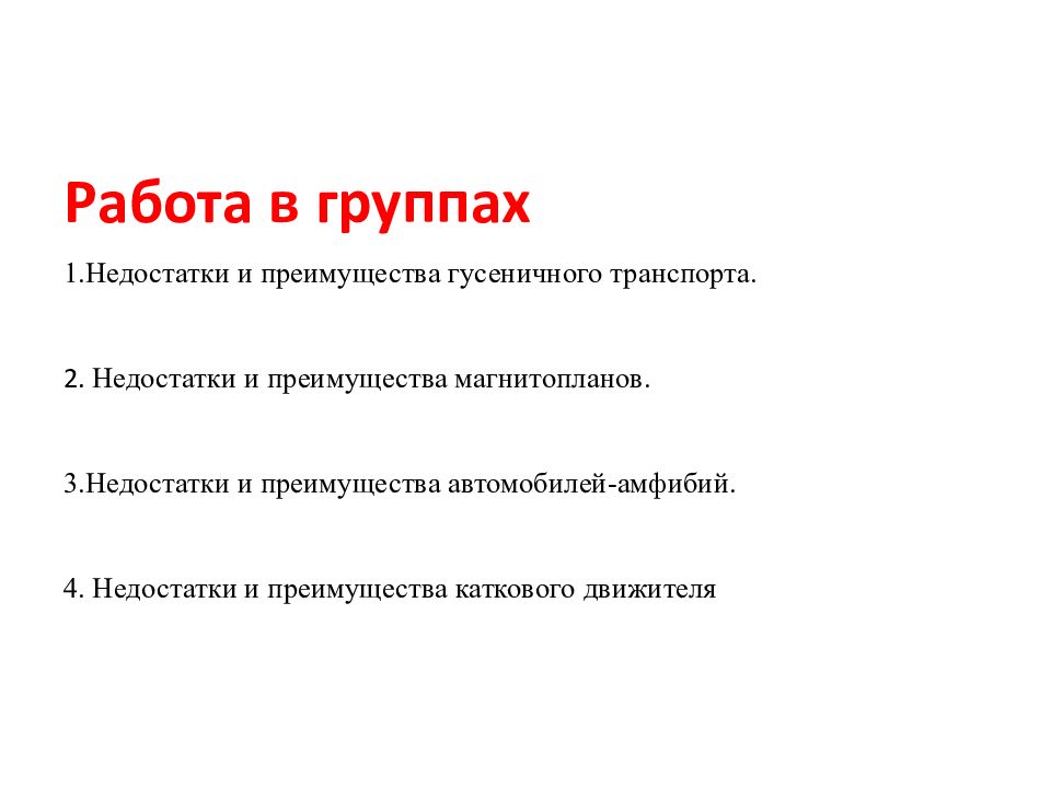Слайд 27: Работа в группах 1.Недостатки и преимущества гусеничного транспорта. 2. Недостатки и преимущества магнитопланов. 3.Недостатки и преимущества автомобилей-амфибий. 4. Недостатки и преимущества каткового движителя