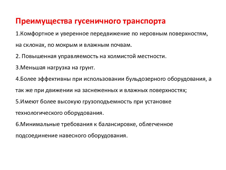 Преимущества гусеничного транспорта 1.Комфортное и уверенное передвижение по неровным поверхностям, на склонах, по мокрым и влажным почвам. 2. Повышенная управляемость на холмистой местности. 3.Меньшая нагрузка на грунт. 4.Более эффективны при использовании бульдозерного оборудования, а так же при движении на заснеженных и влажных поверхностях; 5.Имеют более высокую грузоподъемность при установке технологического оборудования. 6.Минимальные требования к балансировке, облегченное подсоединение навесного оборудования.