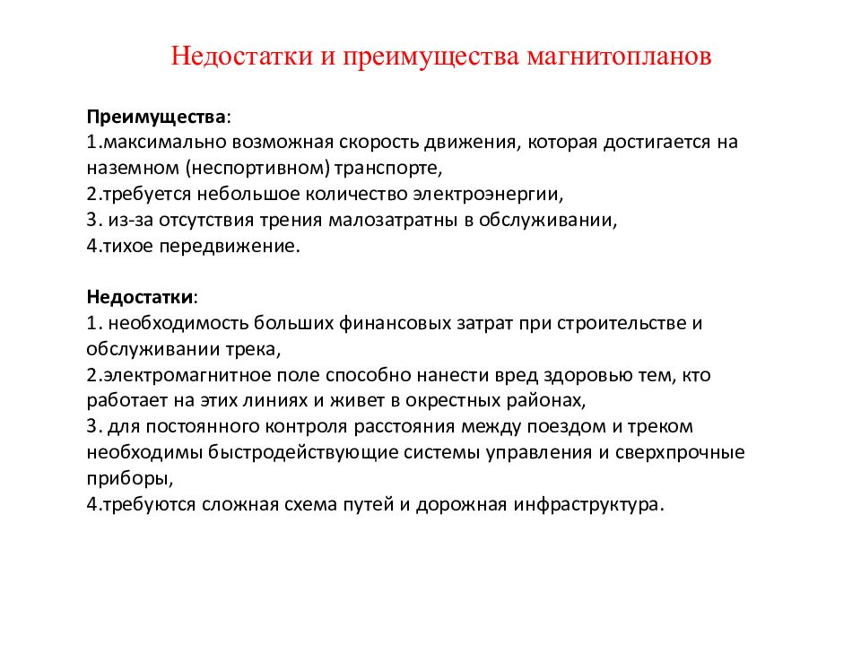 Преимущества : 1.максимально возможная скорость движения, которая достигается на наземном (неспортивном) транспорте, 2.требуется небольшое количество электроэнергии, 3. из-за отсутствия трения малозатратны в обслуживании, 4.тихое передвижение. Недостатки : 1. необходимость больших финансовых затрат при строительстве и обслуживании трека, 2.электромагнитное поле способно нанести вред здоровью тем, кто работает на этих линиях и живет в окрестных районах, 3. для постоянного контроля расстояния между поездом и треком необходимы быстродействующие системы управления и сверхпрочные приборы, 4.требуются сложная схема путей и дорожная инфраструктура. Недостатки и преимущества магнитопланов