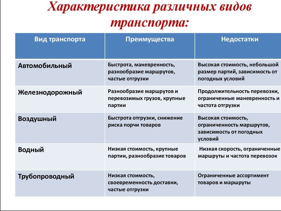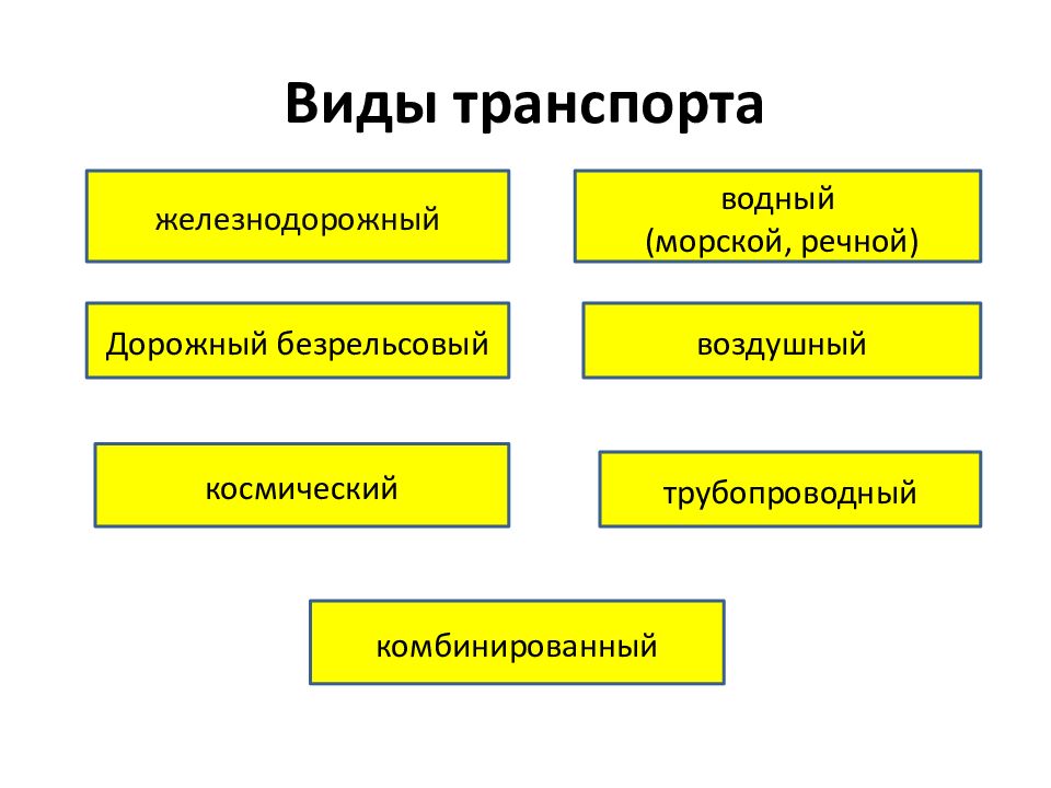 железнодорожный космический трубопроводный Дорожный безрельсовый воздушный водный (морской, речной) комбинированный