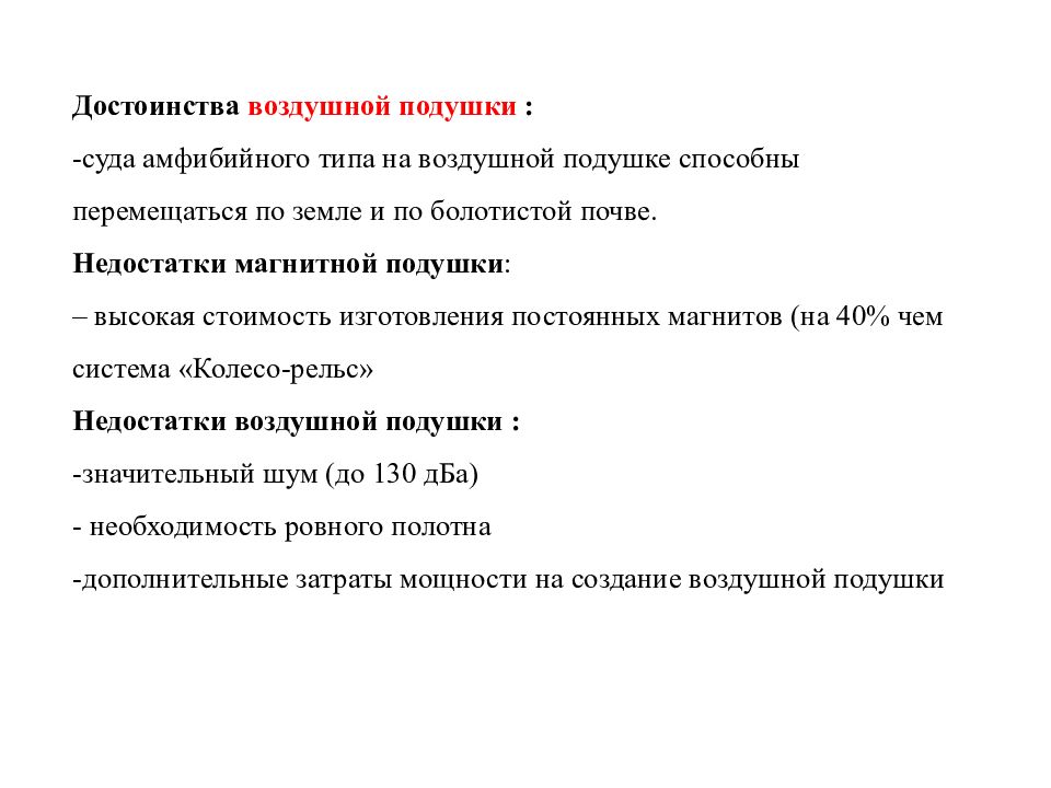 Достоинства воздушной подушки : -суда амфибийного типа на воздушной подушке способны перемещаться по земле и по болотистой почве. Недостатки магнитной подушки : – высокая стоимость изготовления постоянных магнитов (на 40% чем система «Колесо-рельс» Недостатки воздушной подушки : -значительный шум (до 130 дБа ) - необходимость ровного полотна -дополнительные затраты мощности на создание воздушной подушки