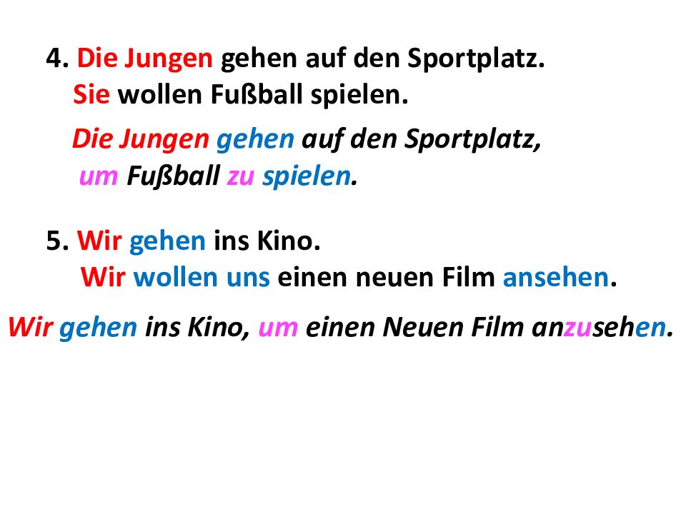 4. Die Jungen gehen auf den Sportplatz. Sie wollen Fußball spielen. 5. Wir gehen ins Kino. Wir wollen uns einen neuen Film ansehen. Die Jungen gehen auf den Sportplatz, um Fußball zu spielen. Wir gehen ins Kino, um einen Neuen Film an zu seh en.