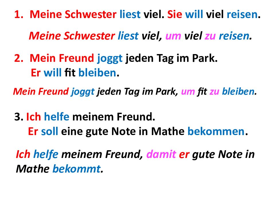 Meine Schwester liest viel. Sie will viel reisen. Mein Freund joggt jeden Tag im Park. Er will fit bleiben. 3. Ich helfe meinem Freund. Er soll eine gute Note in Mathe bekommen. Meine Schwester liest viel, um viel zu reisen. Mein Freund joggt jeden Tag im Park, um fit zu bleiben. Ich helfe meinem Freund, damit er gute Note in Mathe bekommt.