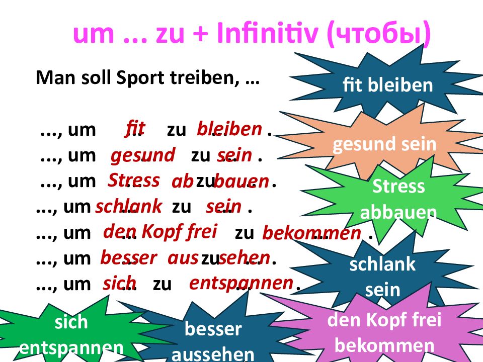 Man soll Sport treiben, … ..., um... zu.... ..., um... zu.... ..., um... zu.... ..., um... zu.... ..., um... zu.... ..., um... zu.... ..., um... zu.... um... zu + Infinitiv ( чтобы ) fit bleiben gesund sein Stress ab bauen schlank sein den Kopf frei bekommen besser aus sehen sich entspannen fit bleiben gesund sein Stress abbauen schlank sein den Kopf frei bekommen besser aussehen sich entspannen