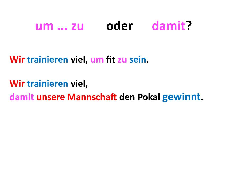 - Wozu? - um... zu + Infinitiv Denis treibt Sport, um mit seinen Freunden zusammen zu sein, um Schulstress abzubauen und den Kopf.... Claudia treibt Sport,... Sven treibt Sport,... frei zu bekommen. um fit und gesund zu bleiben. um sich auszutoben und zu entspannen.