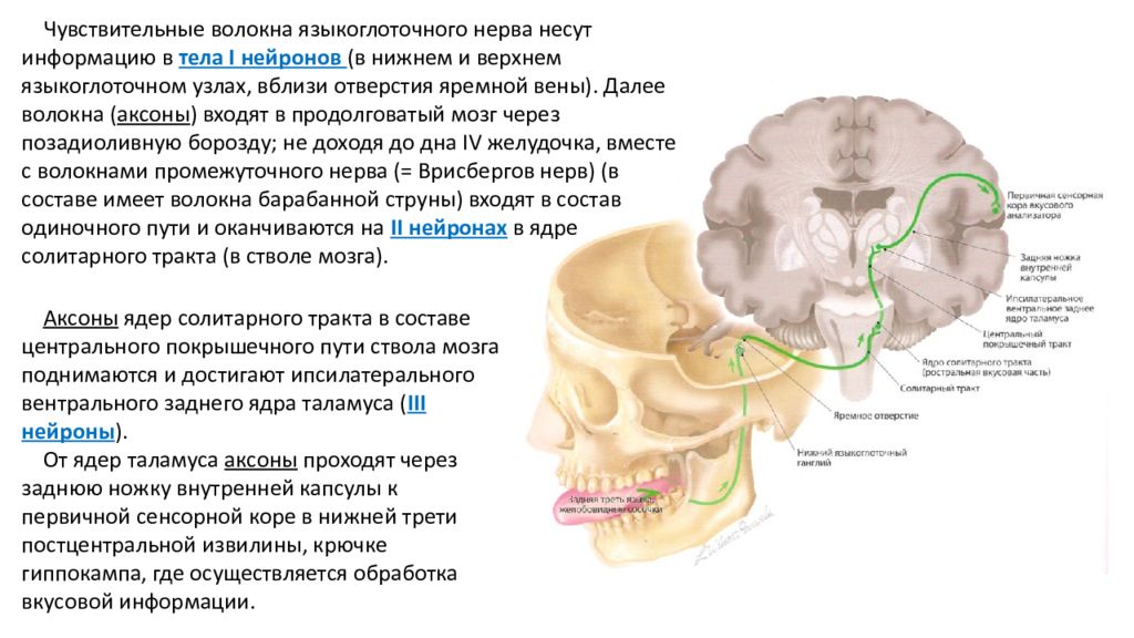 Чувствительные волокна языкоглоточного нерва несут информацию в тела I нейронов (в нижнем и верхнем языкоглоточном узлах, вблизи отверстия яремной вены). Далее волокна ( аксоны ) входят в продолговатый мозг через позадиоливную борозду; не доходя до дна IV желудочка, вместе с волокнами промежуточного нерва (= Врисбергов нерв) (в составе имеет волокна барабанной струны) входят в состав одиночного пути и оканчиваются на II нейронах в ядре солитарного тракта (в стволе мозга). Аксоны ядер солитарного тракта в составе центрального покрышечного пути ствола мозга поднимаются и достигают ипсилатерального вентрального заднего ядра таламуса ( III нейроны ). От ядер таламуса аксоны проходят через заднюю ножку внутренней капсулы к первичной сенсорной коре в нижней трети постцентральной извилины, крючке гиппокампа, где осуществляется обработка вкусовой информации.