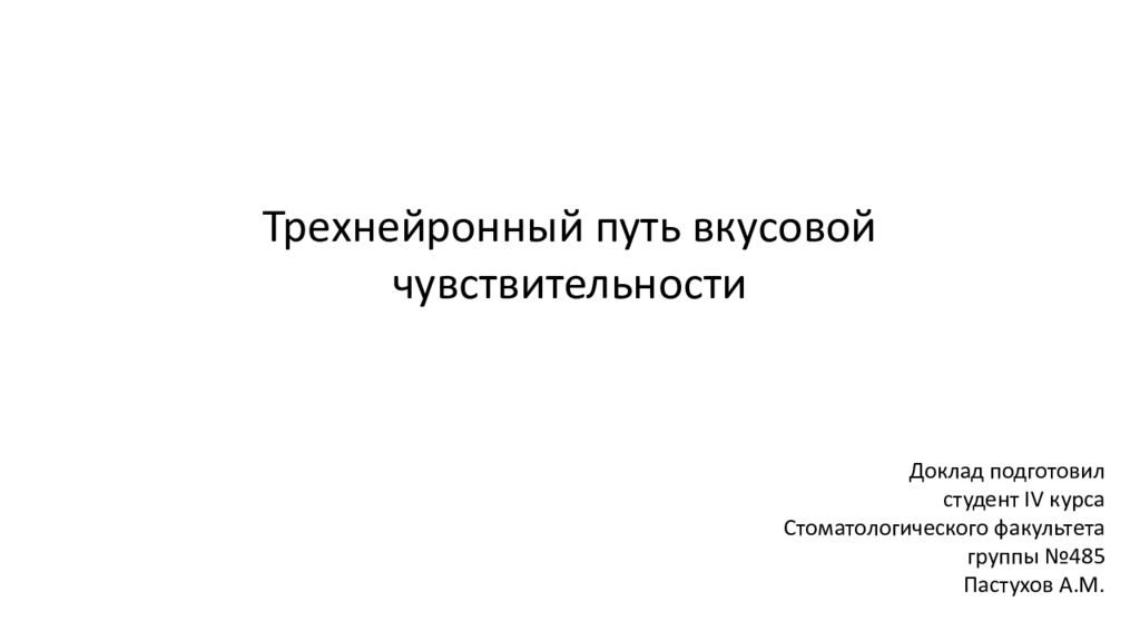 Трехнейронный путь вкусовой чувствительности Доклад подготовил студент IV курса Стоматологического факультета группы №485 Пастухов А.М.
