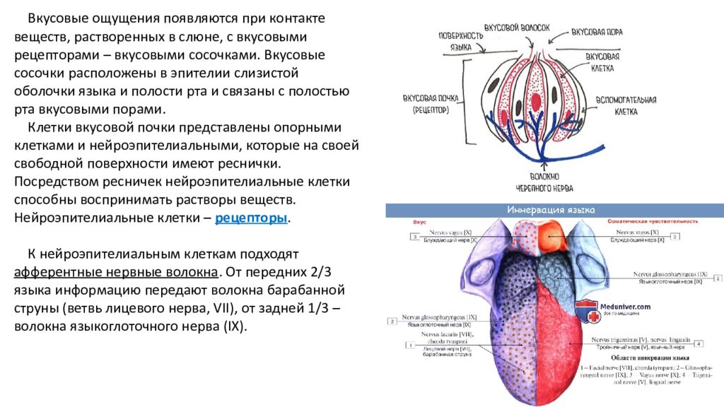 Вкусовые ощущения появляются при контакте веществ, растворенных в слюне, с вкусовыми рецепторами – вкусовыми сосочками. Вкусовые сосочки расположены в эпителии слизистой оболочки языка и полости рта и связаны с полостью рта вкусовыми порами. Клетки вкусовой почки представлены опорными клетками и нейроэпителиальными, которые на своей свободной поверхности имеют реснички. Посредством ресничек нейроэпителиальные клетки способны воспринимать растворы веществ. Нейроэпителиальные клетки – рецепторы. К нейроэпителиальным клеткам подходят афферентные нервные волокна. От передних 2/3 языка информацию передают волокна барабанной струны (ветвь лицевого нерва, VII), от задней 1/3 – волокна языкоглоточного нерва (IX).