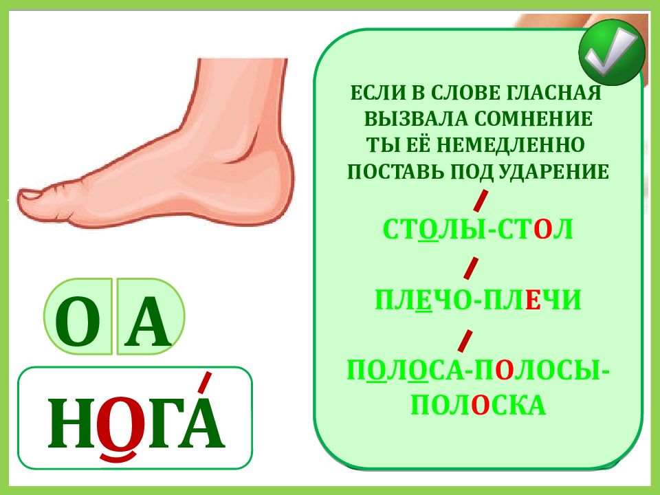 Н ГА А О О НОГИ ЕСЛИ В СЛОВЕ ГЛАСНАЯ ВЫЗВАЛА СОМНЕНИЕ ТЫ ЕЁ НЕМЕДЛЕННО ПОСТАВЬ ПОД УДАРЕНИЕ СТ О ЛЫ-СТ О Л ПЛ Е ЧО-ПЛ Е ЧИ П О Л О СА-П О ЛОСЫ-ПОЛ О СКА