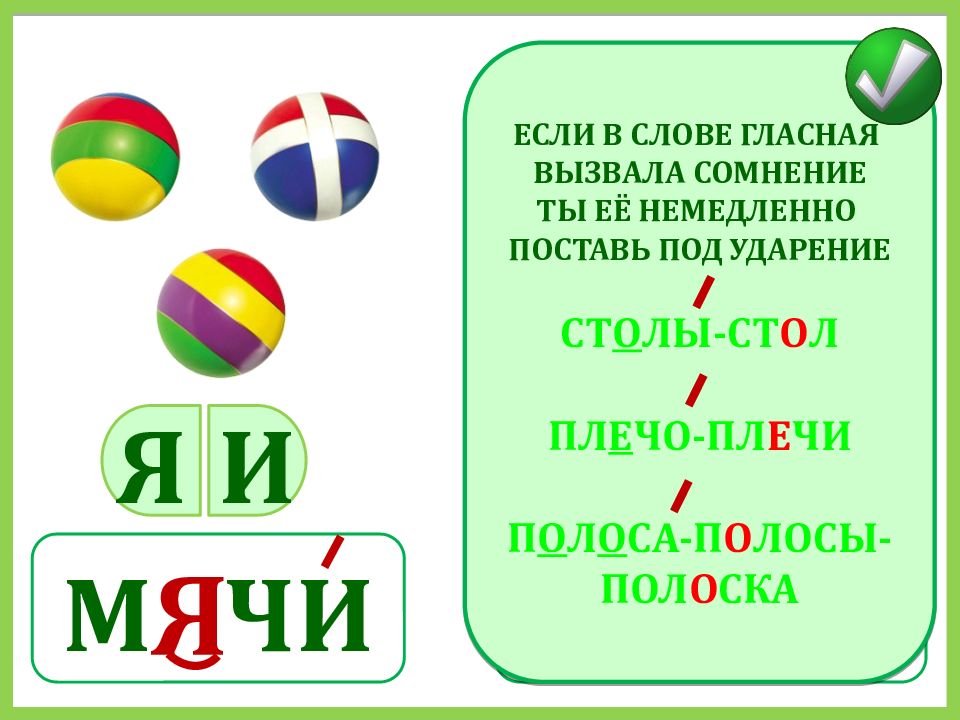 М ЧИ И Я Я МЯЧ ЕСЛИ В СЛОВЕ ГЛАСНАЯ ВЫЗВАЛА СОМНЕНИЕ ТЫ ЕЁ НЕМЕДЛЕННО ПОСТАВЬ ПОД УДАРЕНИЕ СТ О ЛЫ-СТ О Л ПЛ Е ЧО-ПЛ Е ЧИ П О Л О СА-П О ЛОСЫ-ПОЛ О СКА
