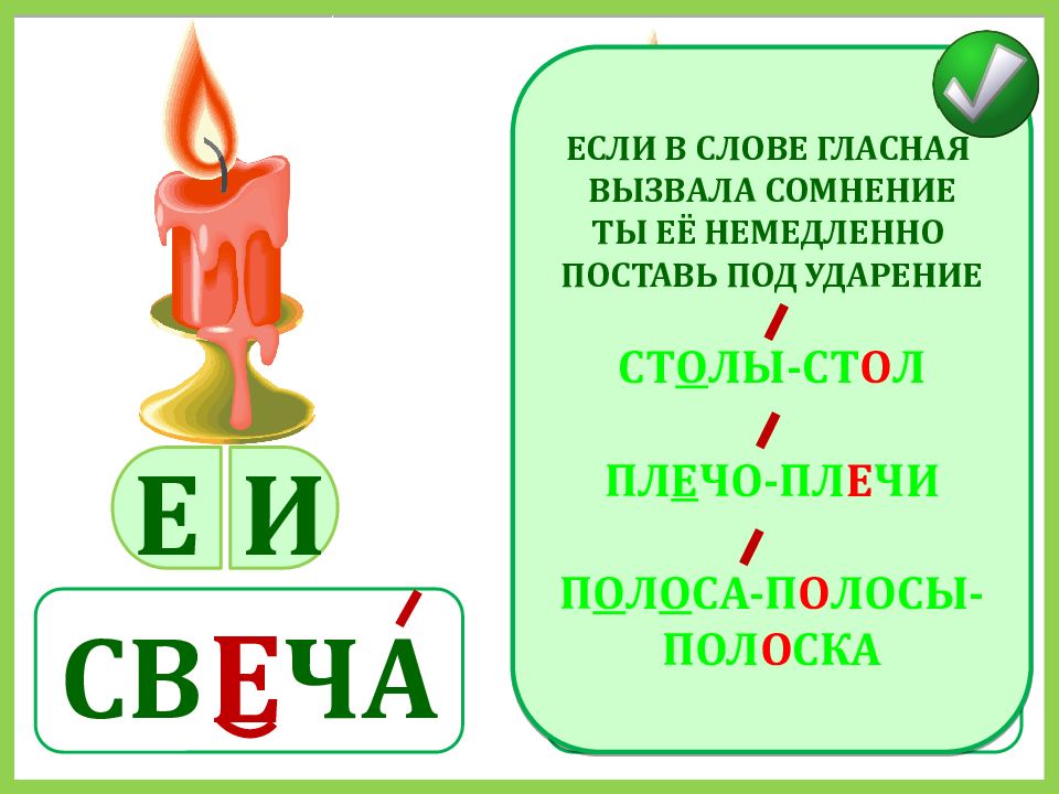 СВ ЧА И Е Е СВЕЧИ ЕСЛИ В СЛОВЕ ГЛАСНАЯ ВЫЗВАЛА СОМНЕНИЕ ТЫ ЕЁ НЕМЕДЛЕННО ПОСТАВЬ ПОД УДАРЕНИЕ СТ О ЛЫ-СТ О Л ПЛ Е ЧО-ПЛ Е ЧИ П О Л О СА-П О ЛОСЫ-ПОЛ О СКА