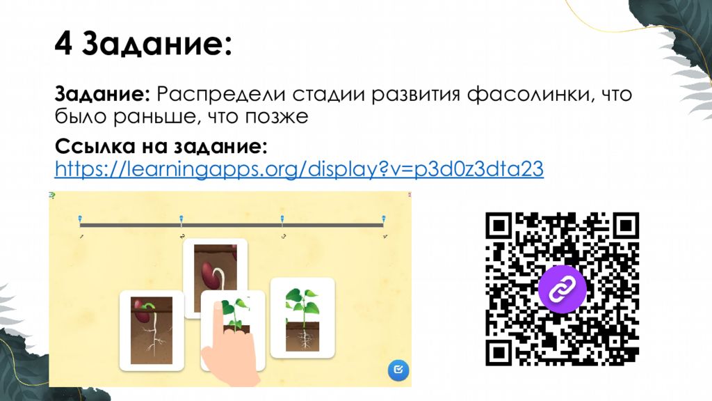 Задание : Распредели стадии развития фасолинки, что было раньше, что позже Ссылка на задание : https://learningapps.org/display?v=p3d0z3dta23