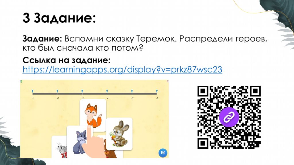 Задание : Вспомни сказку Теремок. Распредели героев, кто был сначала кто потом ? Ссылка на задание : https://learningapps.org/display?v=prkz87wsc23