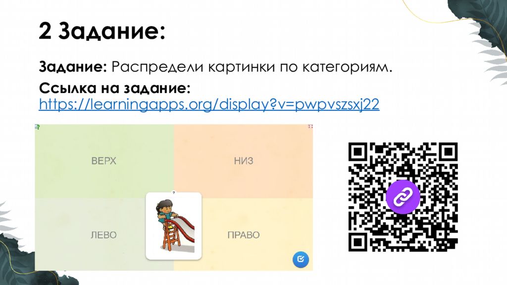 Задание : Распредели картинки по категориям. Ссылка на задание : https://learningapps.org/display?v=pwpvszsxj22