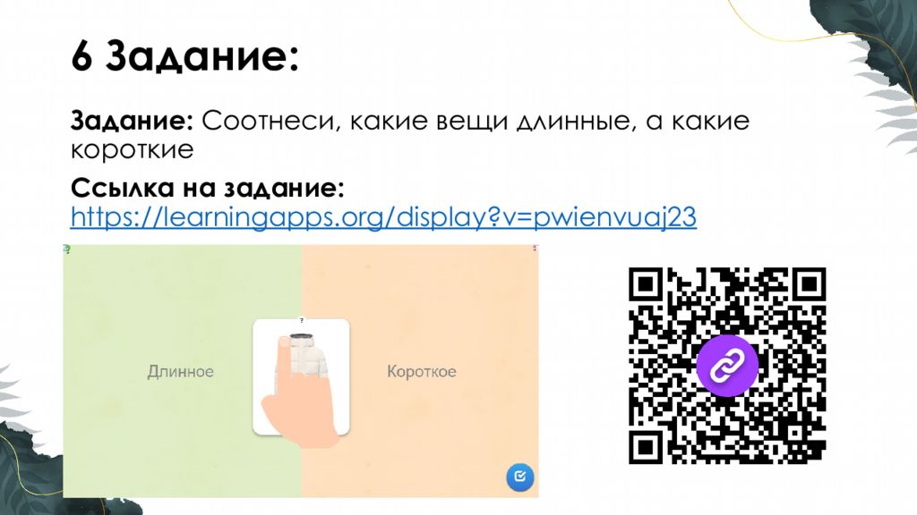 Задание : Соотнеси, какие вещи длинные, а какие короткие Ссылка на задание : https://learningapps.org/display?v=pwienvuaj23