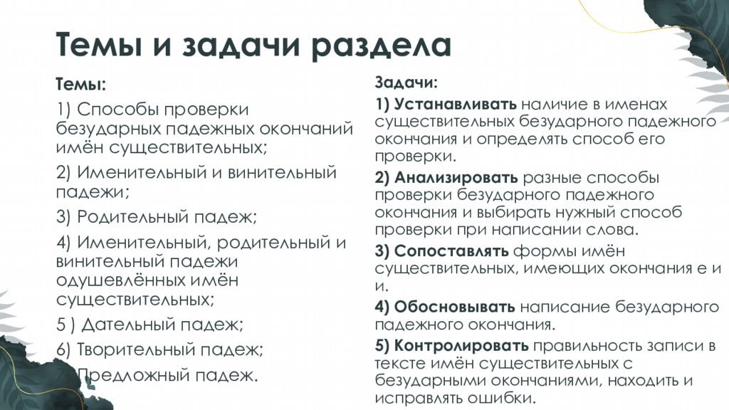 Темы: 1) Способы проверки безударных падежных окончаний имён существительных ; 2) Именительный и винительный падежи ; 3) Родительный падеж ; 4) Именительный, родительный и винительный падежи одушевлённых имён существительных ; 5 ) Дательный падеж ; 6) Творительный падеж ; 7) Предложный падеж. Задачи : 1) Устанавливать наличие в именах существительных безударного падежного окончания и определять способ его проверки. 2) Анализировать разные способы проверки безударного падежного окончания и выбирать нужный способ проверки при написании слова. 3) Сопоставлять формы имён существительных, имеющих окончания е и и. 4) Обосновывать написание безударного падежного окончания. 5) Контролировать правильность записи в тексте имён существительных с безударными окончаниями, находить и исправлять ошибки.