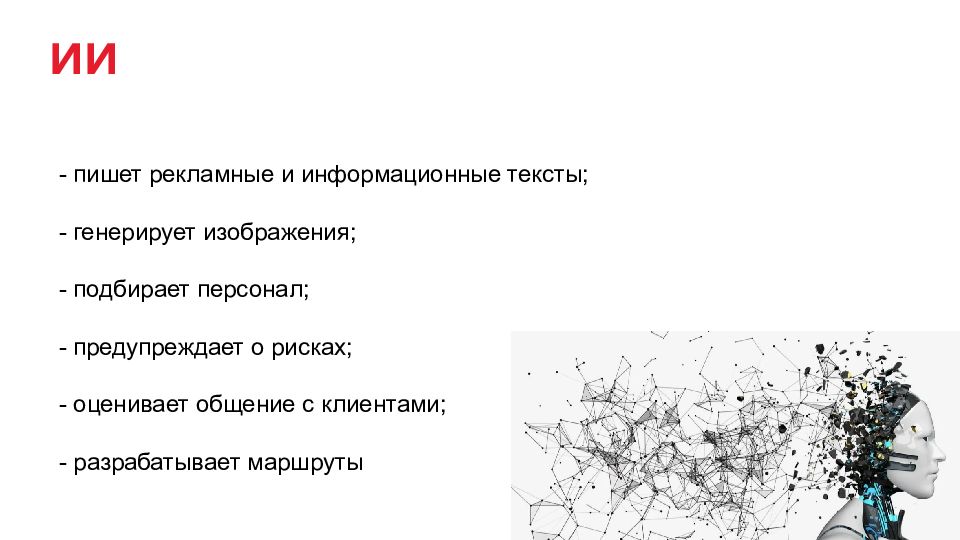 ИИ - пишет рекламные и информационные тексты; - генерирует изображения; - подбирает персонал; - предупреждает о рисках; - оценивает общение с клиентами; - разрабатывает маршруты
