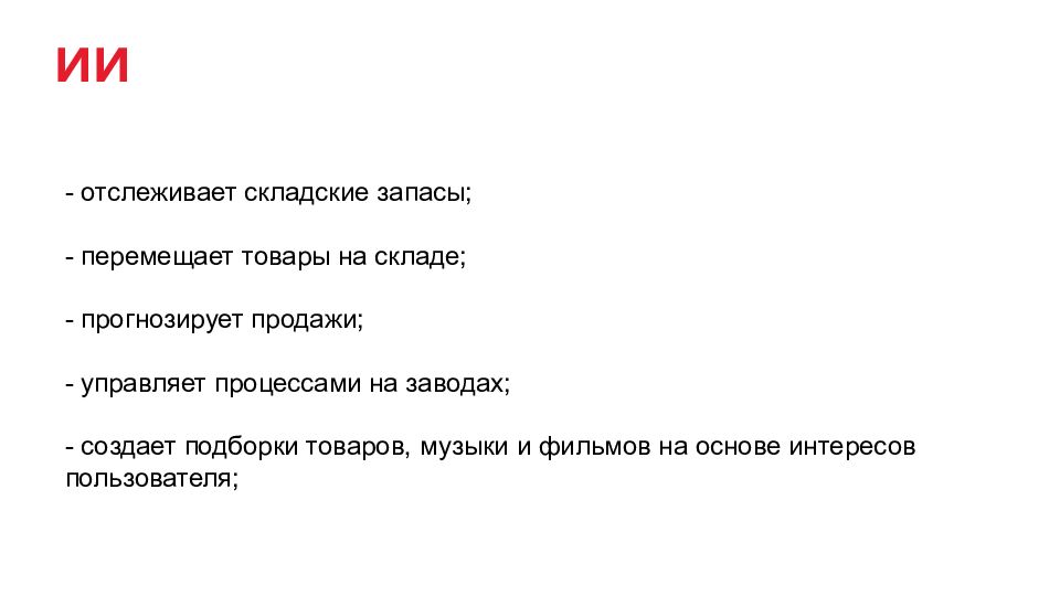 ИИ - отслеживает складские запасы; - перемещает товары на складе; - прогнозирует продажи; - управляет процессами на заводах; - создает подборки товаров, музыки и фильмов на основе интересов пользователя ;