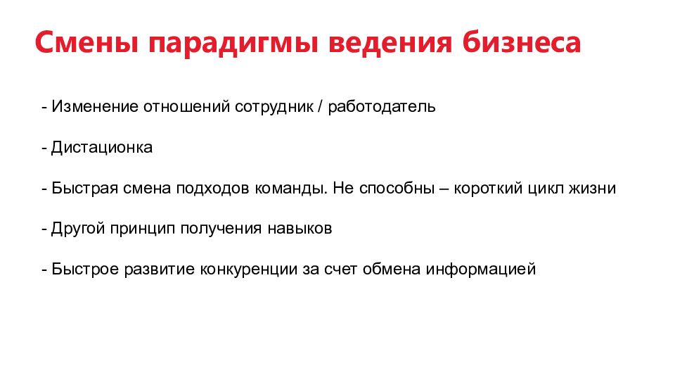 Смены парадигмы ведения бизнеса - И зменение отношений сотрудник / работодатель - Дистационка - Быстрая смена подходов команды. Не способны – короткий цикл жизни - Другой принцип получения навыков - Быстрое развитие конкуренции за счет обмена информацией