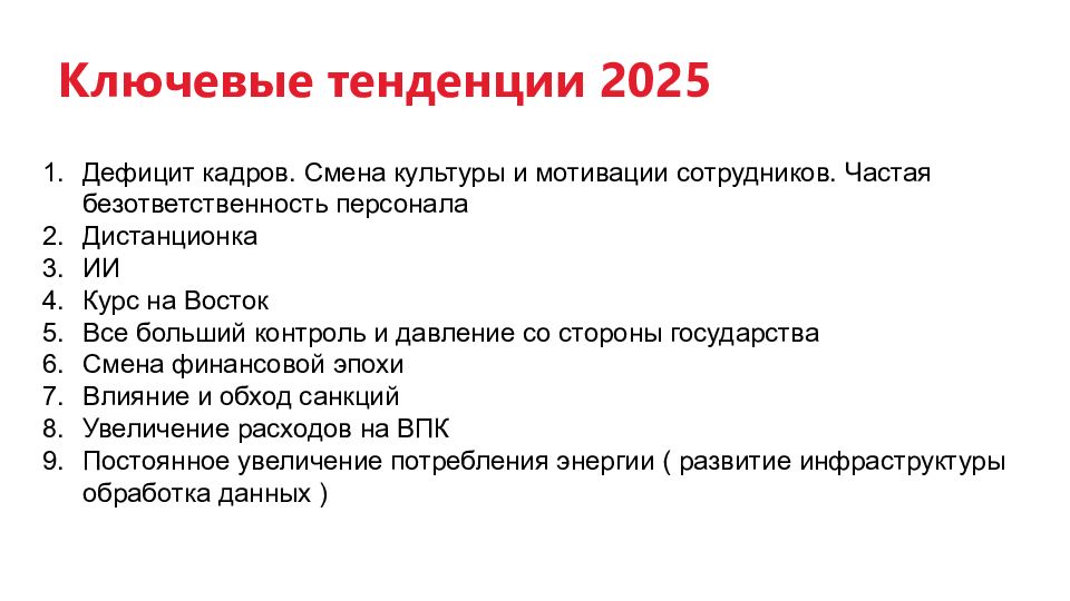 Ключевые тенденции 2025 Дефицит кадров. Смена культуры и мотивации сотрудников. Частая безответственность персонала Дистанционка ИИ Курс на Восток Все больший контроль и давление со стороны государства Смена финансовой эпохи Влияние и обход санкций Увеличение расходов на ВПК Постоянное увеличение потребления энергии ( развитие инфраструктуры обработка данных )