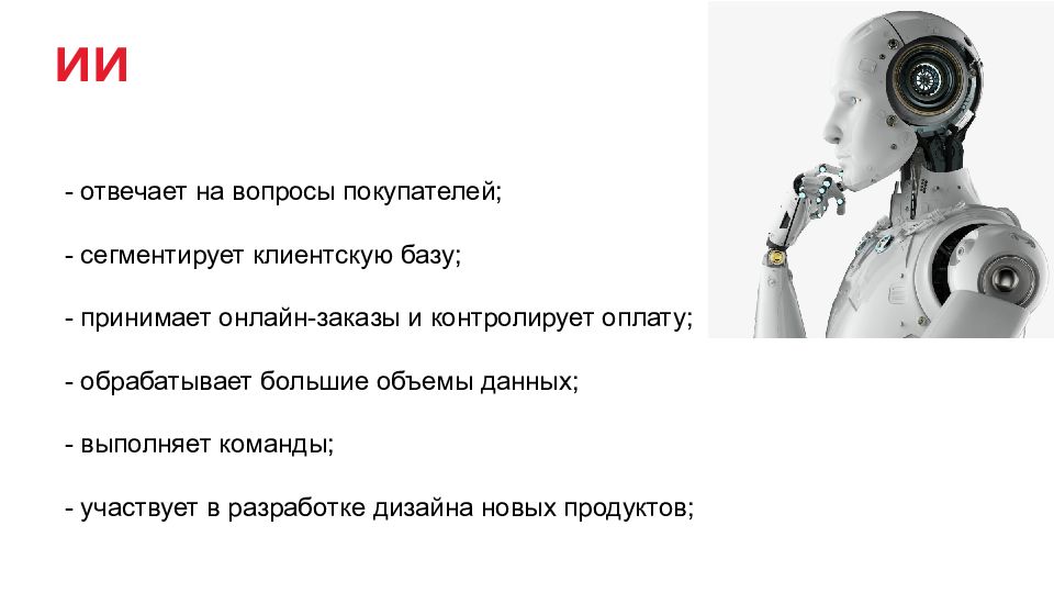 ИИ - отвечает на вопросы покупателей ; - сегментирует клиентскую базу ; - принимает онлайн-заказы и контролирует оплату; - обрабатывает большие объемы данных; - выполняет команды; - участвует в разработке дизайна новых продуктов ;