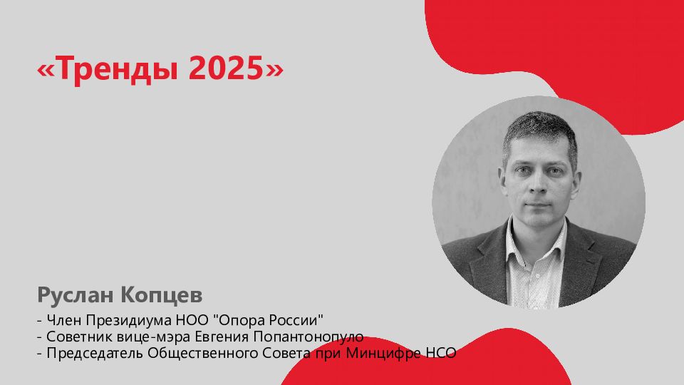 «Тренды 2025» Руслан Копцев - Член Президиума НОО "Опора России" - Советник вице-мэра Евгения Попантонопуло - Председатель Общественного Совета при Минцифре НСО