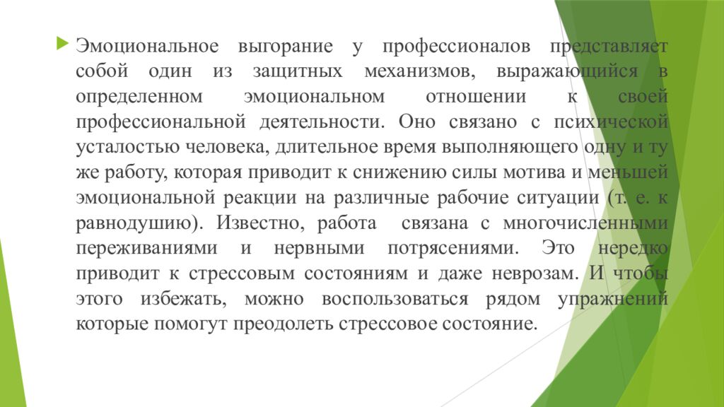 Эмоциональное выгорание у профессионалов представляет собой один из защитных механизмов, выражающийся в определенном эмоциональном отношении к своей профессиональной деятельности. Оно связано с психической усталостью человека, длительное время выполняющего одну и ту же работу, которая приводит к снижению силы мотива и меньшей эмоциональной реакции на различные рабочие ситуации (т. е. к равнодушию). Известно, работа связана с многочисленными переживаниями и нервными потрясениями. Это нередко приводит к стрессовым состояниям и даже неврозам. И чтобы этого избежать, можно воспользоваться рядом упражнений которые помогут преодолеть стрессовое состояние.