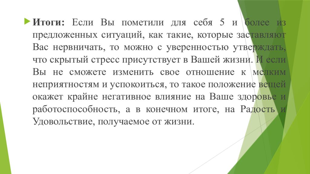 Итоги: Если Вы пометили для себя 5 и более из предложенных ситуаций, как такие, которые заставляют Вас нервничать, то можно с уверенностью утверждать, что скрытый стресс присутствует в Вашей жизни. И если Вы не сможете изменить свое отношение к мелким неприятностям и успокоиться, то такое положение вещей окажет крайне негативное влияние на Ваше здоровье и работоспособность, а в конечном итоге, на Радость и Удовольствие, получаемое от жизни.