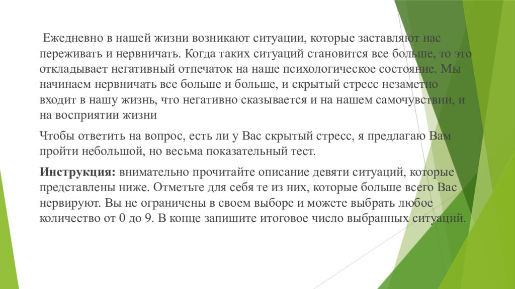 Ежедневно в нашей жизни возникают ситуации, которые заставляют нас переживать и нервничать. Когда таких ситуаций становится все больше, то это откладывает негативный отпечаток на наше психологическое состояние. Мы начинаем нервничать все больше и больше, и скрытый стресс незаметно входит в нашу жизнь, что негативно сказывается и на нашем самочувствии, и на восприятии жизни Чтобы ответить на вопрос, есть ли у Вас скрытый стресс, я предлагаю Вам пройти небольшой, но весьма показательный тест. Инструкция: внимательно прочитайте описание девяти ситуаций, которые представлены ниже. Отметьте для себя те из них, которые больше всего Вас нервируют. Вы не ограничены в своем выборе и можете выбрать любое количество от 0 до 9. В конце запишите итоговое число выбранных ситуаций.