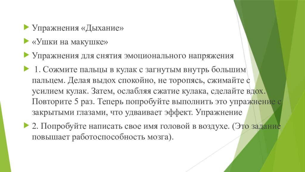 Упражнения «Дыхание» «Ушки на макушке» Упражнения для снятия эмоционального напряжения 1. Сожмите пальцы в кулак с загнутым внутрь большим пальцем. Делая выдох спокойно, не торопясь, сжимайте с усилием кулак. Затем, ослабляя сжатие кулака, сделайте вдох. Повторите 5 раз. Теперь попробуйте выполнить это упражнение с закрытыми глазами, что удваивает эффект. Упражнение 2. Попробуйте написать свое имя головой в воздухе. (Это задание повышает работоспособность мозга).