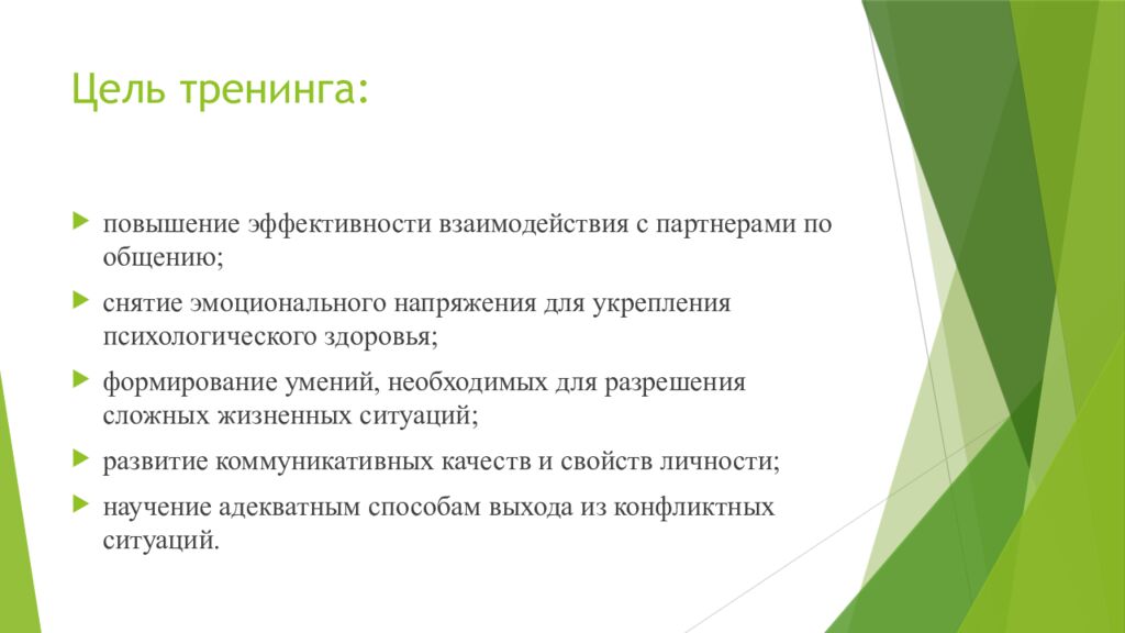 повышение эффективности взаимодействия с партнерами по общению; снятие эмоционального напряжения для укрепления психологического здоровья; формирование умений, необходимых для разрешения сложных жизненных ситуаций; развитие коммуникативных качеств и свойств личности; научение адекватным способам выхода из конфликтных ситуаций.