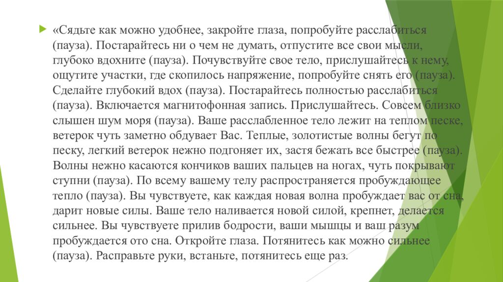 «Сядьте как можно удобнее, закройте глаза, попробуйте расслабиться (пауза). Постарайтесь ни о чем не думать, отпустите все свои мысли, глубоко вдохните (пауза). Почувствуйте свое тело, прислушайтесь к нему, ощутите участки, где скопилось напряжение, попробуйте снять его (пауза). Сделайте глубокий вдох (пауза). Постарайтесь полностью расслабиться (пауза). Включается магнитофонная запись. Прислушайтесь. Совсем близко слышен шум моря (пауза). Ваше расслабленное тело лежит на теплом песке, ветерок чуть заметно обдувает Вас. Теплые, золотистые волны бегут по песку, легкий ветерок нежно подгоняет их, застя бежать все быстрее (пауза). Волны нежно касаются кончиков ваших пальцев на ногах, чуть покрывают ступни (пауза). По всему вашему телу распространяется пробуждающее тепло (пауза). Вы чувствуете, как каждая новая волна пробуждает вас от сна, дарит новые силы. Ваше тело наливается новой силой, крепнет, делается сильнее. Вы чувствуете прилив бодрости, ваши мышцы и ваш разум пробуждается ото сна. Откройте глаза. Потянитесь как можно сильнее (пауза). Расправьте руки, встаньте, потянитесь еще раз.