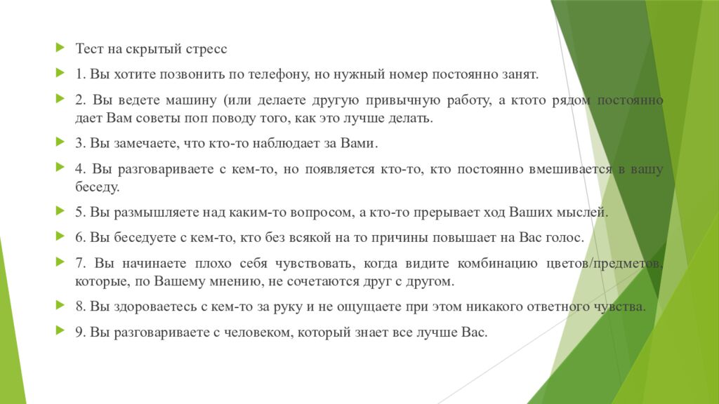 Тест на скрытый стресс 1. Вы хотите позвонить по телефону, но нужный номер постоянно занят. 2. Вы ведете машину (или делаете другую привычную работу, а ктото рядом постоянно дает Вам советы поп поводу того, как это лучше делать. 3. Вы замечаете, что кто-то наблюдает за Вами. 4. Вы разговариваете с кем-то, но появляется кто-то, кто постоянно вмешивается в вашу беседу. 5. Вы размышляете над каким-то вопросом, а кто-то прерывает ход Ваших мыслей. 6. Вы беседуете с кем-то, кто без всякой на то причины повышает на Вас голос. 7. Вы начинаете плохо себя чувствовать, когда видите комбинацию цветов/предметов, которые, по Вашему мнению, не сочетаются друг с другом. 8. Вы здороваетесь с кем-то за руку и не ощущаете при этом никакого ответного чувства. 9. Вы разговариваете с человеком, который знает все лучше Вас.